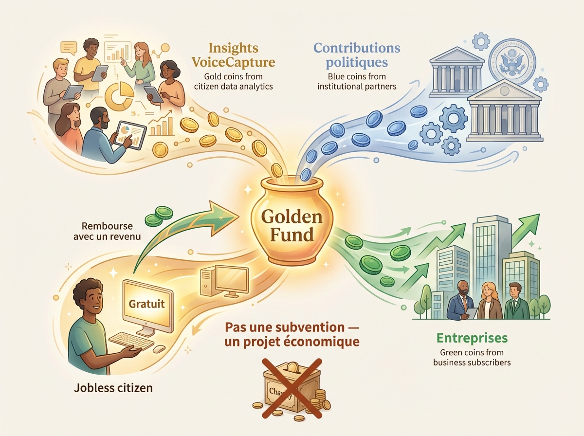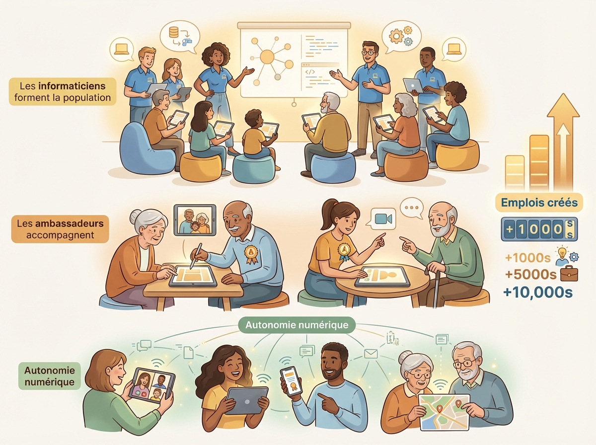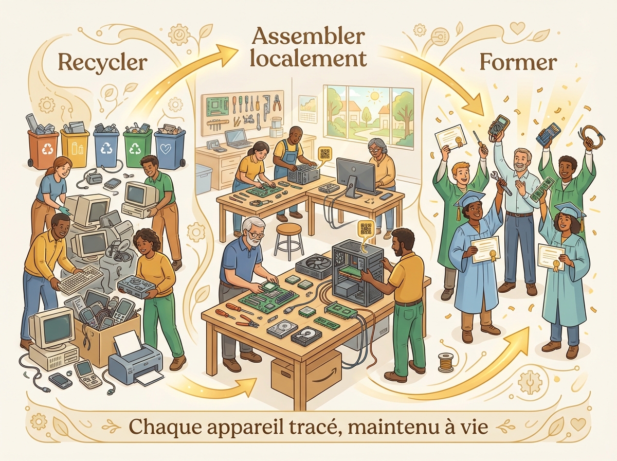 Le projet d'équité numérique démarre simultanément avec l'écosystème — non après, non plus tard. C'est la même machine qui pilote les deux. Smatflow lance un projet économique parallèle, entièrement piloté, entièrement construit par ses participants — personnes physiques, responsables politiques et entreprises — pour doter chaque famille d'un ordinateur connecté à l'écosystème en construction.