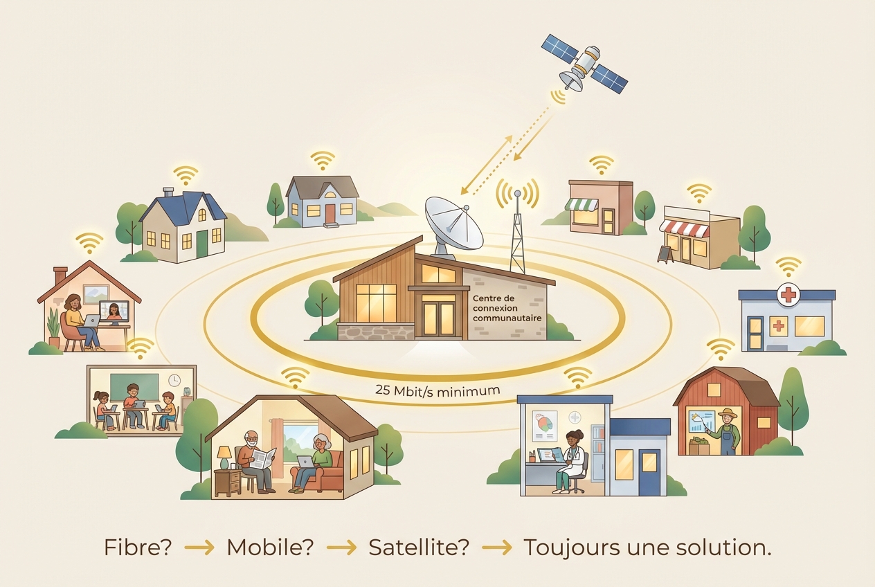 Dans des villages, des quartiers, des zones, on met en place une infrastructure de connexion qui reçoit le signal — par fibre, mobile ou satellite — et le diffuse par Wi-Fi longue distance. La connexion s'effectue à travers l'identité numérique fournie par l'écosystème. Les locaux communautaires existent partout — l'infrastructure s'y greffe.