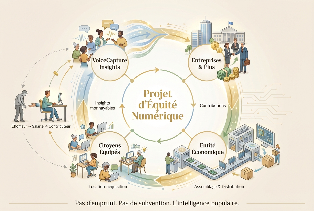 Les insights VoiceCapture génèrent des revenus. Une multinationale qui souhaite investir dans un pays dispose, via l'écosystème, d'un outil considérable pour évaluer le marché — des données d'opinion à l'échelle de la population entière, non d'un échantillon de mille personnes. Cet outil n'est pas gratuit. Les citoyens participent volontairement aux études, sachant que les retombées financent leur écosystème.