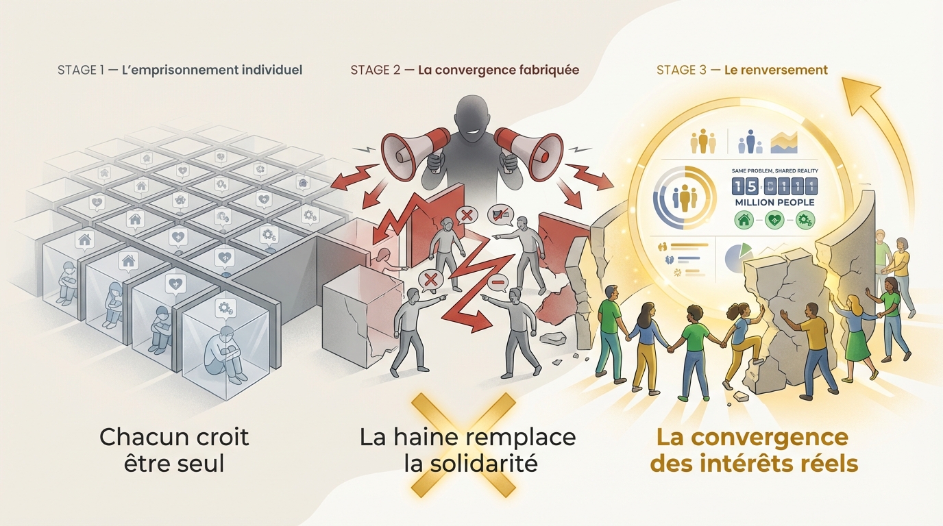 Chaque citoyen, pris isolément, est enfermé dans ses problèmes. Son chômage est son chômage. Son loyer impayé est son loyer impayé. Sa maladie non soignée est sa maladie. Il se bat seul contre un mur. Et le mur ne bouge pas — parce qu'un individu seul ne peut pas le déplacer.