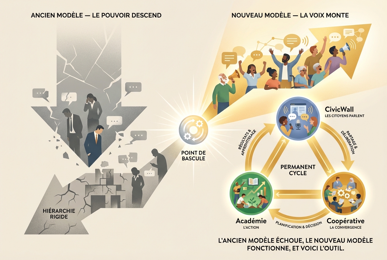 La réponse porte un nom : la Gouvernance Ascendante. Au lieu que le pouvoir descende, la parole monte. Le citoyen s'exprime, le système capte, structure et transforme cette parole en action. Cette philosophie a un outil opérationnel : l'écosystème technologique — CivicWall, la Coopérative, Academy. Trois piliers qui matérialisent la parole citoyenne en emploi, en formation, en gouvernance.
