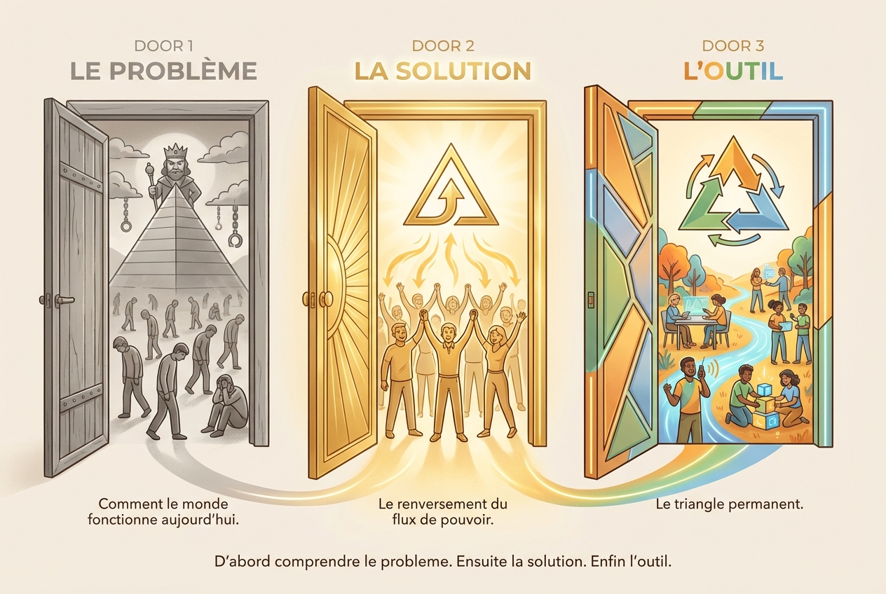 Ce qui suit présente le chemin complet. D'abord l'objectif — ce que le projet veut atteindre. Puis le diagnostic — pourquoi le monde échoue. Enfin la solution — comment le renversement fonctionne et quels outils le rendent concret.